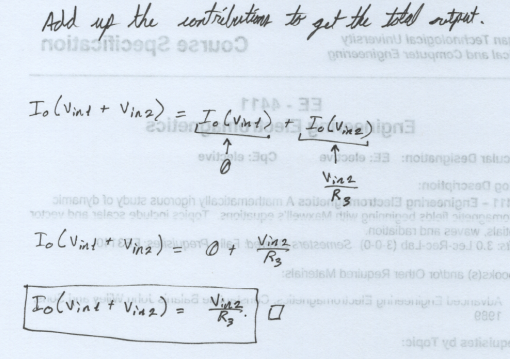If you remember from all our previous lessons so far, there wasn't a single variable with an exponent greater than 1. That's because the circuit's we've been working with are all linear. Because they're linear, we can use a cheat code to solve them: superposition. Superposition says that if you have multiple inputs and just one output, you can consider what the output would look like with each input separately, then add up all the results. Mathematically, if you have inputs \( x_1 \) and \( x_2 \), and your output function is some function \( f, \) superposition says that \[ f(x_1 + x_2) = f(x_1) + f(x_2) \] and \[ f (\alpha x) = \alpha f(x). \]